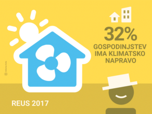Rezultati Raziskave energetske učinkovitosti Slovenije – REUS 2017 kažejo kako 1015 anketiranih slovenskih gospodinjstev hladi svoja stanovanja, ko jim je prevroče. Slaba tretjina gospodinjstev (32%) za hlajenje bivalnih prostorov uporablja klimatske naprave. V dveh letih se je število gospodinjstev, ki uporabljajo klimatsko napravo povečalo za četrtino. Več kot polovica (53%) klimatske naprave uporablja tudi za ogrevanje. Skoraj tri četrtine (72%) klimatsko napravo vklopi, ko zunanja temperatura preseže 28 °C. Pri tem pa slabi dve tretjini (59%) vzdržuje notranjo temperaturo med 22 in 25 °C.